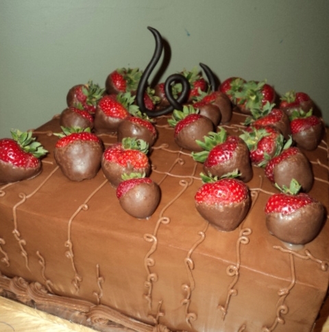 Chocolate Dipped Strawberries atop a white cake topped with chocolate buttercream
